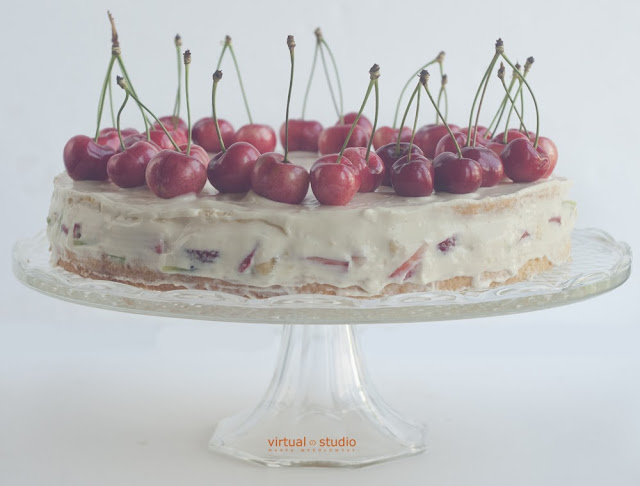 Biszkopt z owocami i kremem budyniowym. Ze względu na dodatek świeżych owoców najlepiej smakuje w dniu przygotowania. Biszkopt można upiec dzień wcześniej. Poza sezonem czereśniowym i truskawkowym można go przełożyć tylko bananem i kiwi, a do dekoracji użyć plasterków kiwi.